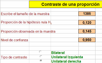 En la imagen vemos incorporado el dato del tamaño de la muestra, 1385, la proporción de la hipótesis nula, 0,12, y la alternativa de 0,145.