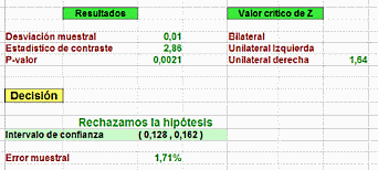 Otra forma de verlo es con el p-valor, que es la probabilidad, si la hipótesis nula fuera cierta, de que se produzca un resultado del 14,5%. Lee en el esquema su valor, que es de 0,0021, algo muy cercano a cero, prácticamente imposible. Por tanto, nuestra decisión debe ser: