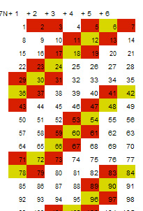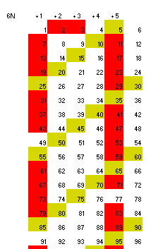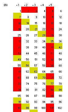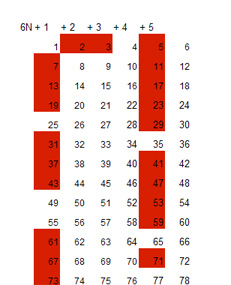 En el caso de 6 columnas se puede comprobar que todos los primos son de la forma 6n+1 o 6n+5, porque a partir del 5 sólo se rellenan de primos estas dos columnas.