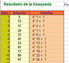 Vuelve a iniciar la búsqueda y obtendrás los mismos números primos, esta vez expresados como suma de cuadrados, con lo que queda comprobado el teorema.