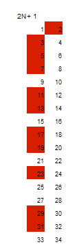Este esquema divide a los números en pares e impares. Lo único que es posible destacar n él es que todos los números primos (salvo el 2) caen en la columna de los impares.