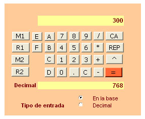 Esta otra calculadora imita a aquellas, como las de euro y peseta, que efectúan los cálculos de dos formas diferentes y simultáneas. En este caso se trata de operar en el sistema de numeración decimal y en otro elegido al efecto. Dispone, como la anterior de la tecla Repetir y de dos memorias. Se puede elegir en ella si se escriben los datos en forma decimal o en la base elegida. En ambos casos se efectúan los cálculos en las dos bases.