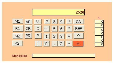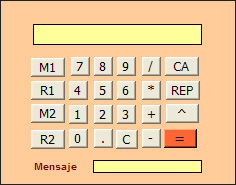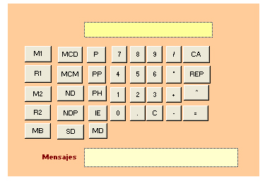 Esta calculadora opera sobre los anillos Z/Zn. Realiza sumas, restas, productos, etc. En las divisiones devuelve todas las soluciones, si existen. Con la tecla Repetir permite estudiar el orden de los elementos, el conjunto de sus potencias, y otras muchas propiedades. Dispone de dos memorias para cálculos más complejos.