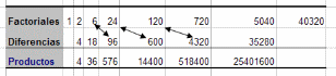 Los productos de abajo tendrán como factores los indicados por las flechas: cada diferencia con el factorial anterior¿Qué relación existe entre cada producto y el factorial de su misma columna? Comprueba añadiendo una fila nueva.