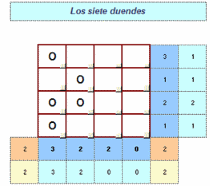 En un tablero de 4 por 4 se esconden 7 duendes. Conocemos la cuenta de los que hay por filas, columnas y diagonales. Con esos datos se intenta localizarlos.